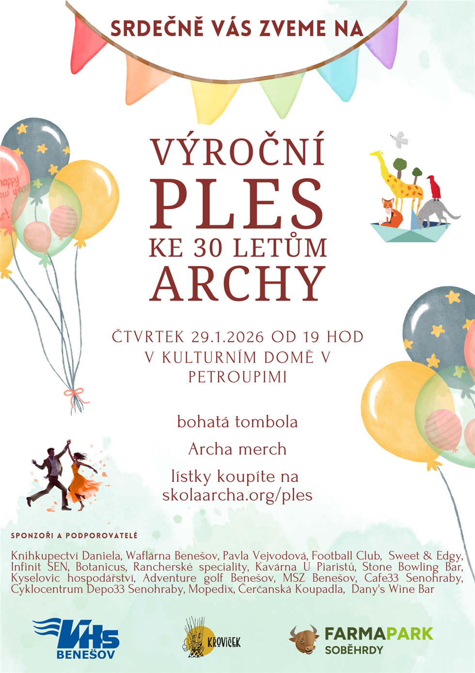 Během večera se můžete těšit na taneční hudbu, kvalitní catering, prodej Archa merche a také na bohatou tombolu. Připraveny budou pestré ceny – poukazy do kaváren a wellness, vstupy do dětských heren, knihy i drobné radosti k jídlu a pití.