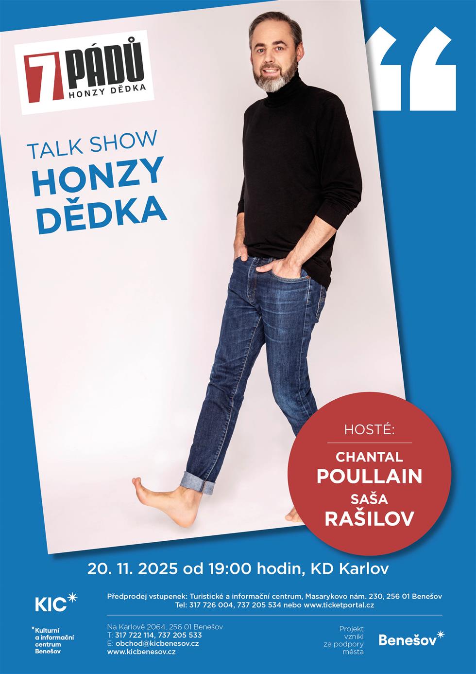 Charismatický moderátor a publicista Honza Dědek přiváží svůj večer plný humoru, zajímavých příběhů a nečekaných otázek – tentokrát s exkluzivními hosty:Chantal Poullain – herečka s nezaměnitelným šarmem a hlasem, žena s pestrým životním příběhemSaša Rašilov – populární herec a moderátor s citem pro humor i hlubší témataTěšte se na vtipné momenty, otevřená vyprávění i spontánní reakce. Přijďte si užít večer, kde se smích i dojetí potkávají u jednoho stolu.