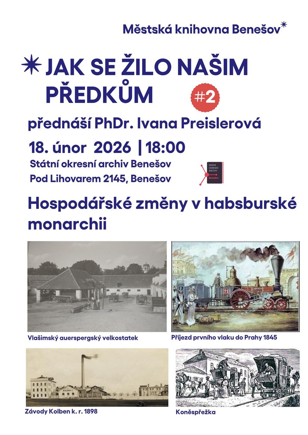 Cyklus přednášek PhDr. Ivany Preislerové nás v šesti setkáních seznámí s životem ve 2. pol. 19 století až do vypuknutí Velké války. Tématem druhé přednášky jsou Hospodářské změny v habsburské monarchii. Přednášky se budou konat pravidelně ve Státním okresním archivu Benešov.