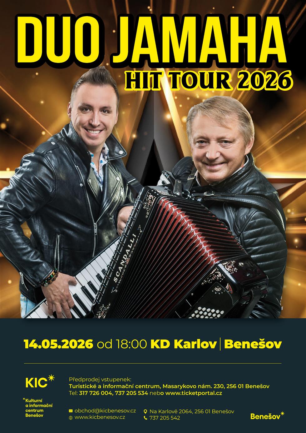 Hudební skupina DUO JAMAHA přichází s HIT Tour – koncert složený z největších hitů hudební skupiny namíchaný s humorným slovem a to i záhoráckým Stand-Up vystoupením, o které se postará právě jeden z členů hudební skupiny.