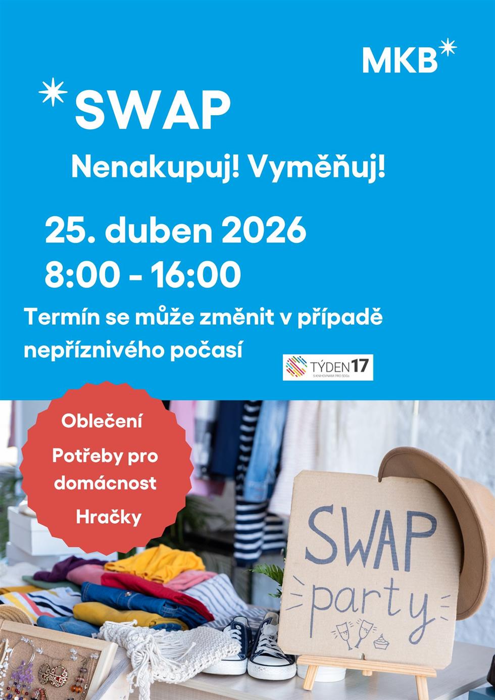 Buďte cool a nenakupujte ale vyměňujte. Pravidelný swap se koná v sobotu 25. dubna v prostorách knihovny od 8:00 do 16:00 hodin. Termín se může změnit v případě nepříznivého počasí.