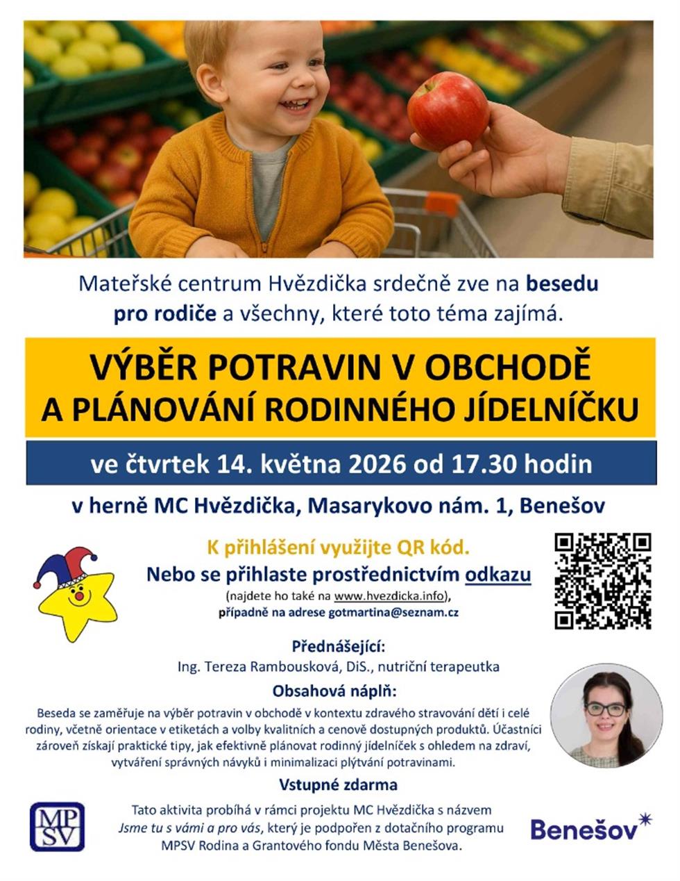 Beseda se zaměřuje na výběr potravin v obchodě v kontextu zdravého stravování dětí i celé rodiny, včetně orientace v etiketách a volby kvalitních a cenově dostupných produktů. Účastníci zároveň získají praktické tipy, jak efektivně plánovat rodinný jídelníček s ohledem na zdraví, vytváření správných návyků i minimalizaci plýtvání potravinami.